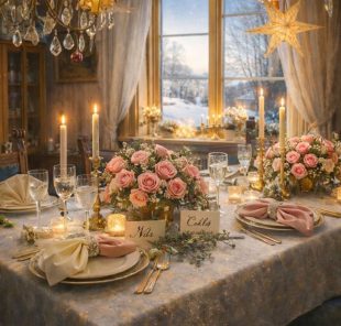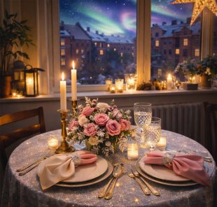 Dukningarna är medvetet hållna mjuka och levande, med rosor i bleka toner, varmt ljus från levande ljus och detaljer som inte är helt lika, men hör ihop. Fönstren, snön och kvällsljuset får vara en del av rummet – som en stillsam kuliss snarare än dekoration.