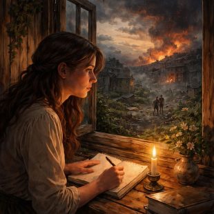 I bilden sitter en ung kvinna vid ett bord, upplyst av ett ensamt ljus.