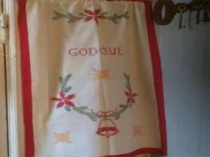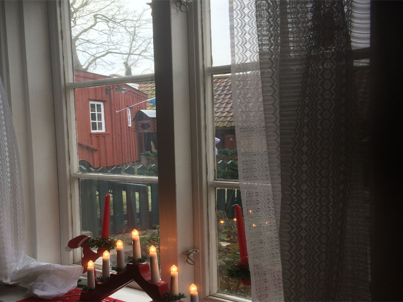 en tänd julgran. Huset var byggt någon gång på 1700 talet. Stugan användes