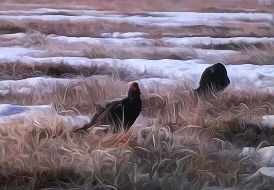 När man tittar på orrarnas lek ute på myren så står där en annan fågel och kikar. Kanske en duvhök. Man kan undra vad den har i görningen. Kl 10:08 står den fortfarande kvar. Skator och kråkor undrar vad det är frågan om. Orrarna får vara försiktiga i myren som delvis är isbelagd. Lätt att överilad kana.