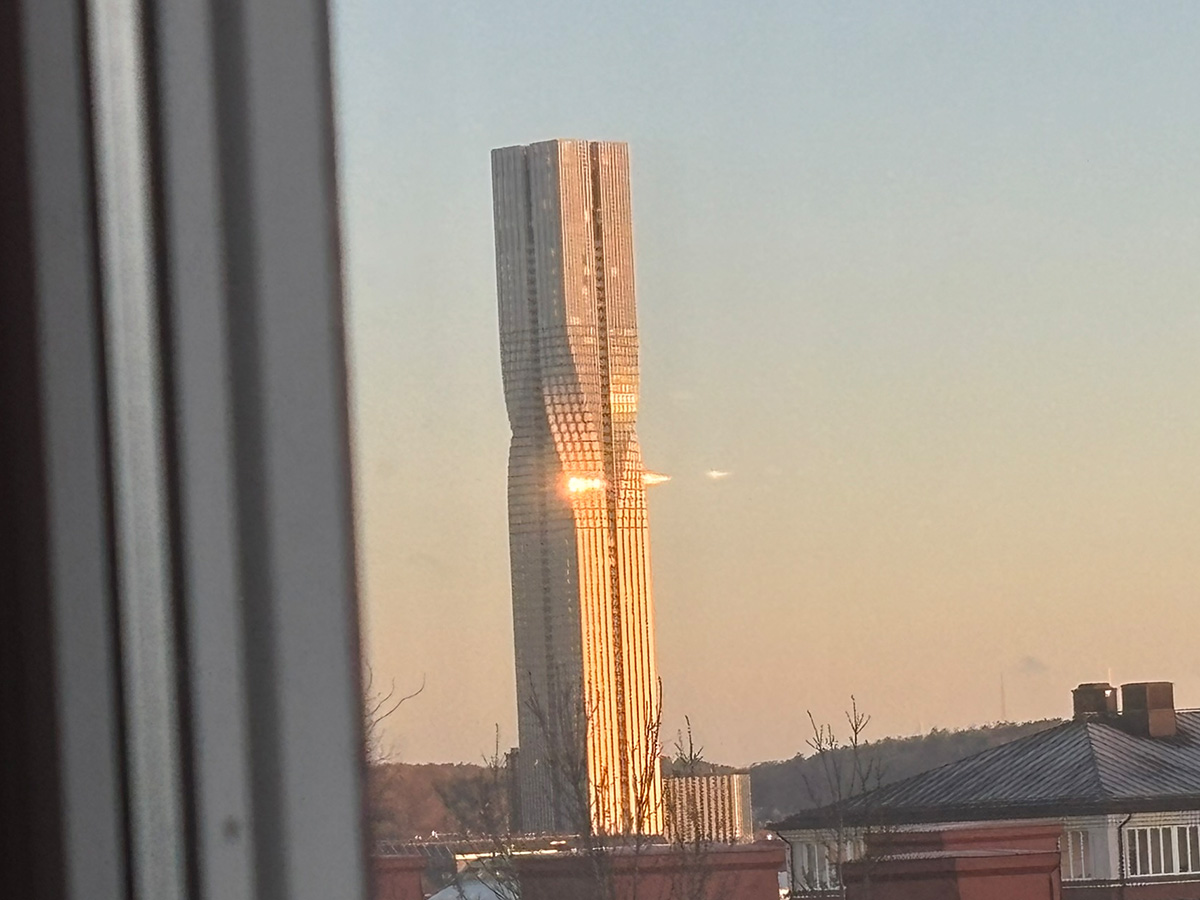 Det är måndag morgon, klockan är 09:23, och från mitt köksfönster betraktar jag Karltornet som badar i solljus. Just nu slår solen in i tornets mitt och reflekteras tillbaka som ett intensivt, bländande ljus – så starkt att det är omöjligt att fästa blicken där utan att känna obehag. Det ser nästan magiskt ut, men jag funderar på om detta skarpa ljus kan vara en risk för förbipasserande flygare. Förhoppningsvis försvinner bländningen snart och lämnar himlen fri för dem.
