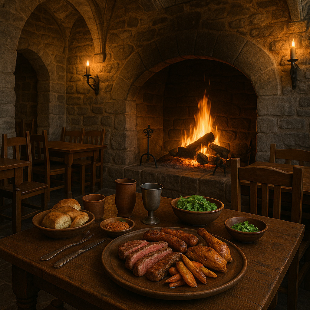 I salens djupa valv, där stenväggarna bär på ekon från svunna tider, sprakar en vedeld i den stora öppna eldstaden. Lågorna kastar sitt sken över grova träbord och enkla stolar, och rummet fylls av värme och en doft av nybakat bröd och grillat kött.