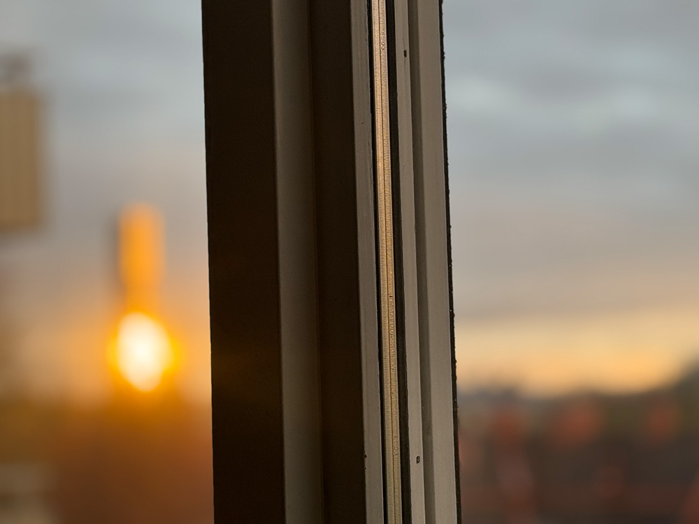 “08.28 – morgonsolen stiger upp och lyser starkt mot Karlatornet, sedd från mitt köksfönster här i Majorna”