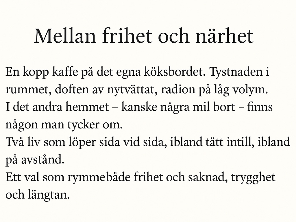 Att leva sitt eget liv, i sitt eget hem, men ändå ha någon att längta till.