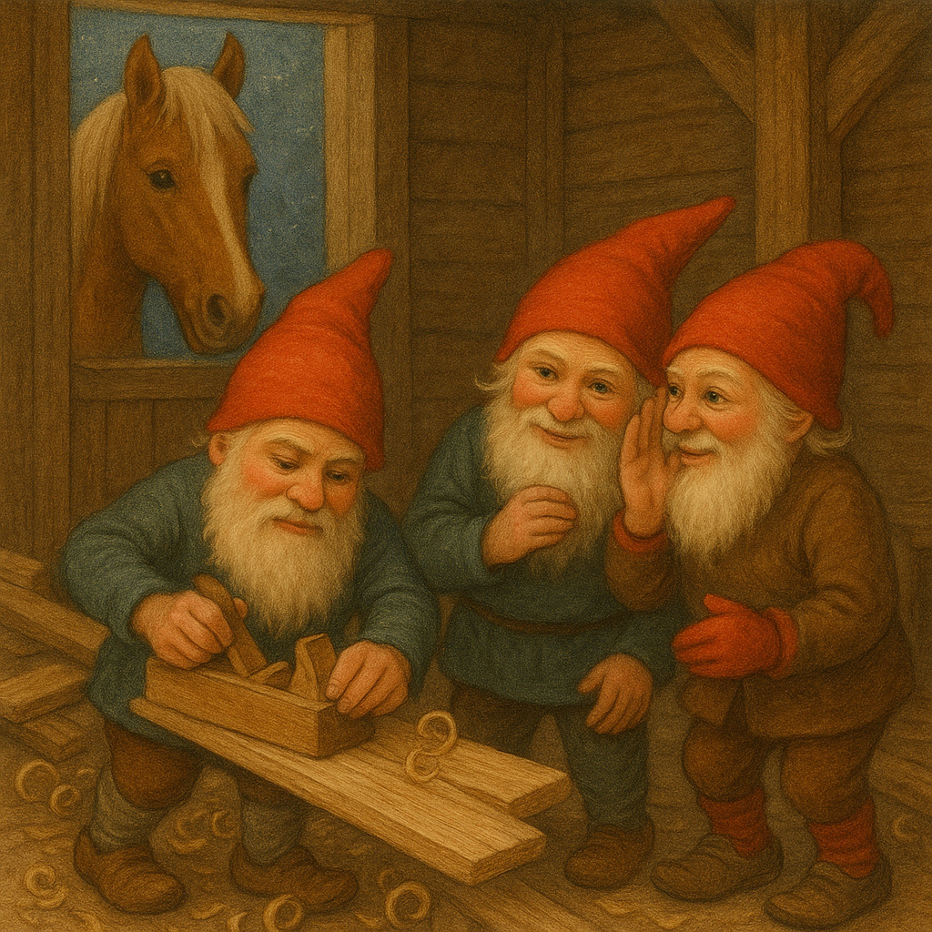 Tre små tomtar i arbete. En hyvlar noggrant, två andra lutar sig nära varandra och viskar. Bakom dem tittar hästen stillsamt in från stallet. Allt andas förtroende, hantverk och den där lågmälda förväntan som hör dagarna före julen till.