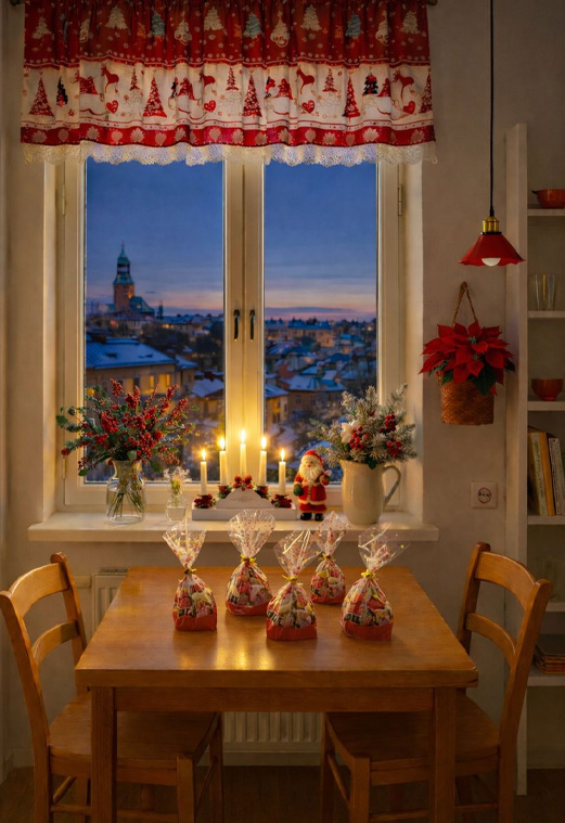 I morse låg det frost på taken här i Majorna. Även om vi inte får snö i år, känns det ändå som riktig jul. Det är klart och soligt, och ljuset speglar sig så vackert i fönsterrutorna. I köket lyser adventsljusstaken, och där på bordet står godispåsarna redo – små paket av glädje.
