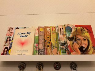 Några av mina böcker på en hylla som jag älskar att bläddra i är Evas kalender. Ett älskat samlarobjekt. Varje bok väcker stark nostalgi igenkänning. Vad hittar man inuti böckerna under alla år men med olika ton? Tex små noveller, tänkvärd texter om vardagen, små recept som förändras tydligt över tid! Fyllda av vardag, råd, bilder och drömmar. Spår av hur det var att vara kvinna då, och hur mycket som hunnit förändras.