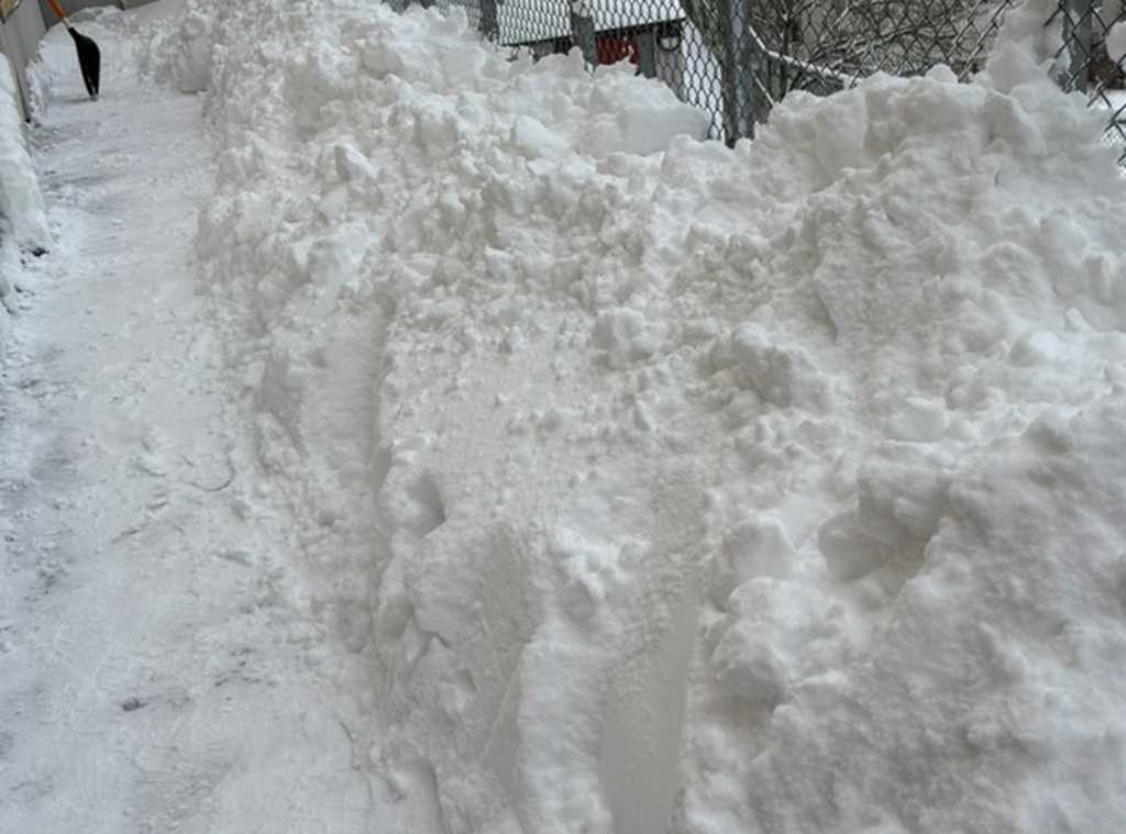 Snövallar längs gångvägen – snöandet håller fortfarande ett fast grepp här i Majorna.