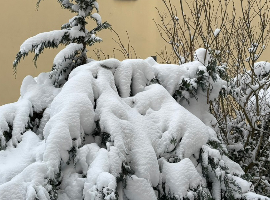 Snön på träd, buskar och tak blir tyngre när den fryser. Grenar kan knäckas, och istappar kan bildas från takkanter. Hoppas, hoppas det blir mildare väder.
