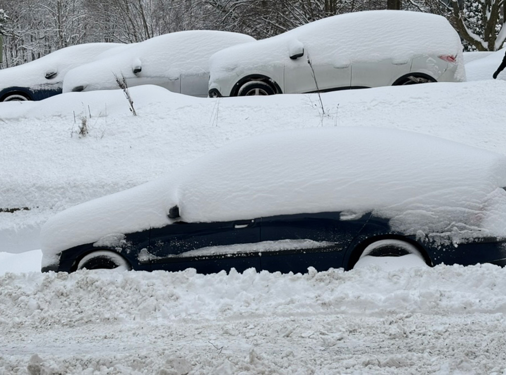 Bilarna längs gatan nästan helt insnöade, bara formerna syns under snötäcket. Min bil längst fram på bild.