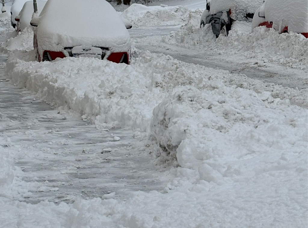 Snöhög vid parkerade bilar, grov och tung efter plogning.