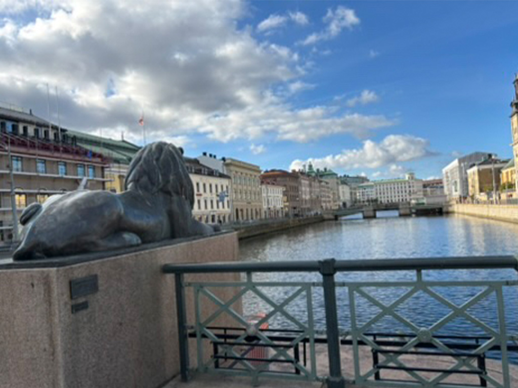Sedan gick jag ut mot kanalen. Vid bron stannade jag vid det välkända lejonet, en klassisk mötesplats för många göteborgare – inte minst vid dejter. Där låg det som alltid stilla och värdigt, med blicken mot vattnet och stadens hus som speglade sig i kanalen.