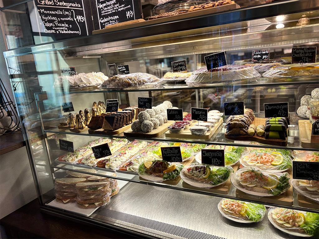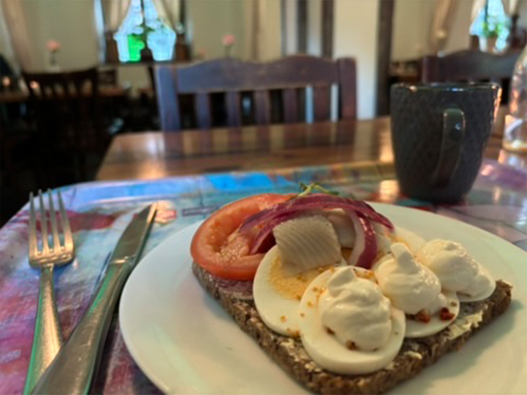 På ett café med svarta fönsterluckor och ljung i blomlådorna tog jag en paus. En smörgås med ägg, sill och rödlök, en kopp kaffe – enkelt och gott.
