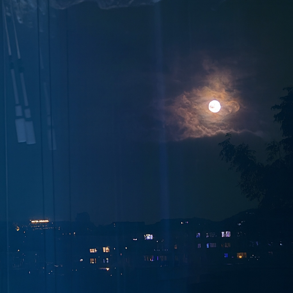 Klockan är 19:31 och äntligen så kan jag se fullmånen. Molnen spricker upp emellanåt.