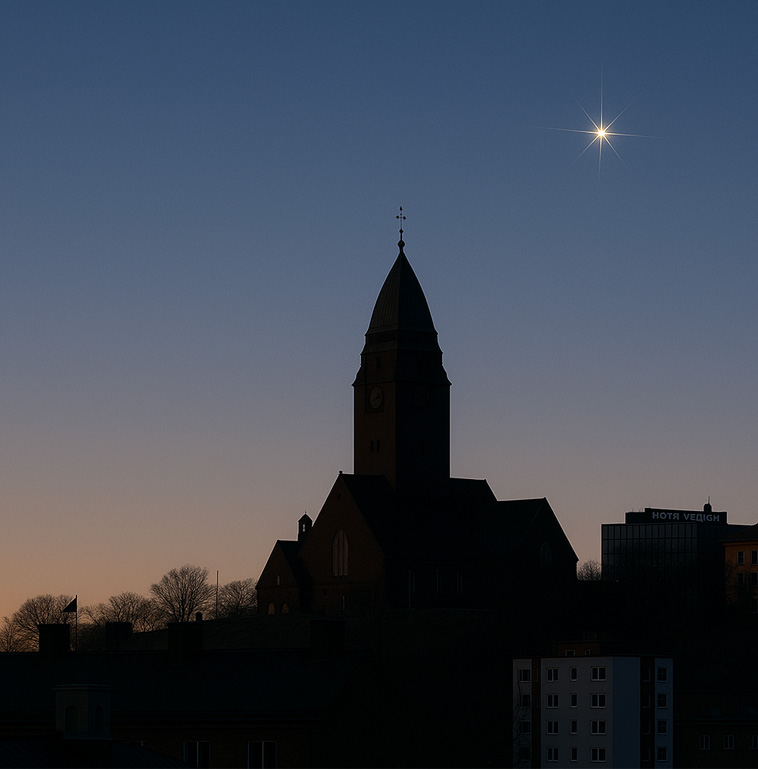 Tidigt på morgonen, strax efter klockan sex, stod jag vid köksfönstret i Majorna. Himlen var klar och gråblå i gryningsljuset. Masthuggskyrkan låg mörk och stilla mot horisonten, men ovanför kyrkan, lite åt höger, lyste Venus klart – morgonstjärnan.